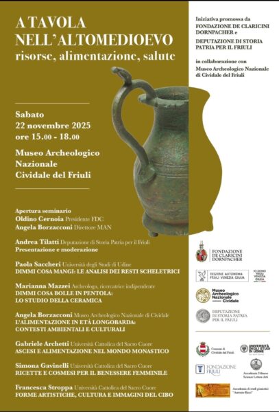 Il seminario, moderato da Andrea Tilatti, sarà introdotto da Oldino Cernoia, presidente della Fondazione de Claricini Dornpacher e da Angela Borzacconi, Direttore del Museo Archeologico Nazionale di Cividale. Interverranno Paola Saccheri dell’Università degli Studi di Udine, Marianna Mazzei archeologa e ricercatrice indipendente, Angela Borzacconi per il Museo Archeologico di Cividale e Gabriele Archetti, Simona Gavinelli e Francesca Stroppa dell’Università Cattolica del Sacro Cuore.