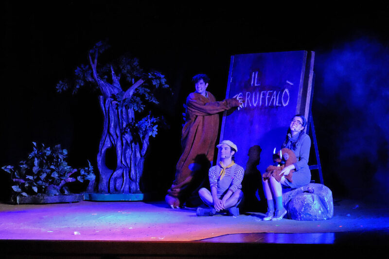 Il musical “Il Gruffalò” segue nella drammaturgia e nei costumi i personaggi dell’omonimo poema della scrittrice inglese Julia Donaldson, illustrato dal tedesco Axel Scheffler, per essere più riconoscibile ai bambini. Una produzione nazionale di Fondazione Aida, completamente riallestita, in co-produzione col Teatro stabile del Veneto. Un topolino nel “bosco frondoso” per sfuggire alla volpe, alla civetta e al serpente s’inventa un mostro terribile: il Gruffalò che “ha zanne tremende, artigli affilati, denti bagnati di bava, un bitorzolo verde sul naso, occhi arancioni, aculei violacei sulla pelliccia e una lingua molliccia”. Tutto il musical parla di questo leggendario mostro, il quale appare però soltanto alla fine, in un travestimento, ma anziché spaventare, sarà lui spaventato. Strepitosi i tre attori protagonisti: Matteo Erli (il Gruffalò), Bianca Ferrarini al suo debutto in questa produzione (Volpe, Civetta, Serpente) ed Ivan Portale (il topolino). Cantano, interpretano in rima, ballano e si muovono riempiendo lo spazio scenico e sprizzando energia a tutti i livelli. Infatti diventa intenso e palpabile lo scambio emotivo col pubblico che applaude, gioisce, suggerisce e partecipa alla “storia boscosa paurosa”. Le musiche originali (di Patrizio Maria D’artista) sono motivetti che entrano in testa e non se ne vanno più. La scenografia di Federico Balestro, è il quarto uomo in scena. Composta di un grande libro, dalle cui pagine sembrano apparire i personaggi e gli elementi del bosco, alberi e rocce, che poi cambiano posizione ad ogni frame e con un sapiente disegno luci, restituiscono delle fiabesche atmosfere notturne e ombrose. Adattamento e regia sono di Manuel Renga. Nel finale, applausi a non finire, bolgia e coda per le foto con i protagonisti e la premiazione con libri Fatatrac di ben 26 bambini, che hanno collezionato tre partecipazioni a “Il teatro siete Voi”. Prima di andarsene, al pubblico viene consegnata la domanda: Ma il Gruffalò, esiste o no?”. La morale è che la paura è normale, ma può essere una grande opportunità e la fantasia vince sempre.