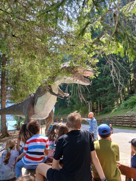 A solleticare la curiosità del pubblico (sia turisti tradizionali che di prossimità) sono state di certo le 22 riproduzioni a grandezza reale di altrettanti dinosauri realizzate da Geomodel srl(laboratorio di Quarto d’Altino, Venezia, specializzato nella realizzazione di ricostruzioni tridimensionali a grandezza naturale, fedeli dal punto di vista scientifico) e dal team di Dinosauri in Carne e Ossa, osservabili lungo la passeggiata sulla riva destra del Lago di Santa Caterina e al parcheggio delle Tre Cime (qui si trova il grande allosauro), ma anche il dialogo che si è voluto creare con le collezioni della sezione naturalistica del Museo di Palazzo Corte Metto, arricchite con i veri fossili di dinosauro provenienti dalle collezioni Bruno Berti e dal prestito della Fondazione Ligabue, conservate al Museo “Le Radici della Vita” di Danta di Cadore. In questo modo si è dato vita ad una mostra diffusa, che invita a vivere e a scoprire il territorio compiendo un viaggio nel tempo straordinario.