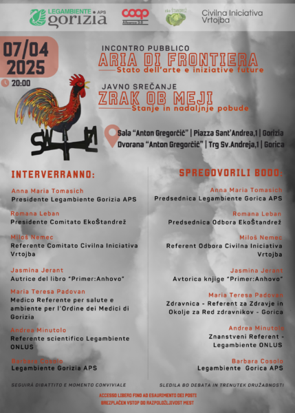 Legambiente Gorizia APS, insieme a EkoŠtandrež e Civilna Iniciativa Vrtojba (SLO) con il supporto di Coop Alleanza 3.0, invitano tutta la cittadinanza a una serata dedicata alla qualità dell’aria sul confine italo-sloveno. L’evento avrà inizio alle 20.00 nella sala parrocchiale di Sant’Andrea/Štandrež lunedì 7 aprile 2025.