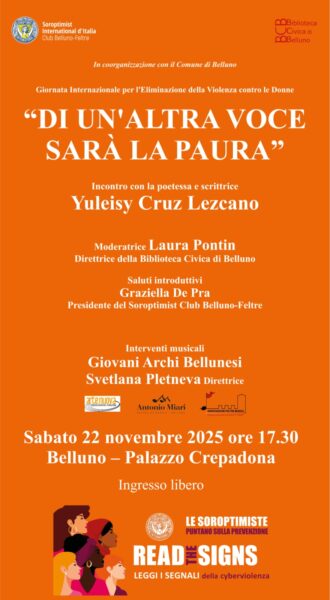 In occasione della Giornata internazionale per l’eliminazione della violenza contro le donne, sabato 22 novembre 2025, dalle 17.30 alle 19.30, la Corte interna di Palazzo Crepadona ospiterà l’incontro/conferenza per presentare il libro “Di un’altra voce sarà la paura – Poesia, denuncia e rinascita”. L’appuntamento, organizzato dal Soroptimist Club Belluno Feltre in collaborazione con il Comune di Belluno, la Biblioteca Civica e il Gruppo Giovani Archi Bellunesi, sarà aperto dai saluti di Graziella De Pra, presidente del Soroptimist Club Belluno Feltre.