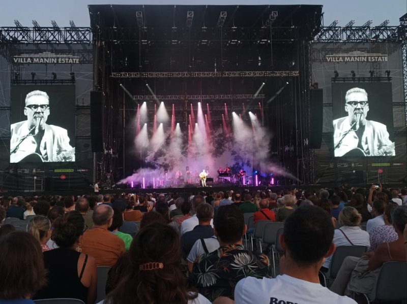 Ottima anche la resa scenica: due maxi schermi in bianco e nero ai lati del palco e un lavoro raffinato sulle luci hanno valorizzato l’ambientazione unica del parco, con il palco incorniciato dai portici curvilinei di Villa Manin, quasi a cullare la musica in uno spazio sospeso.