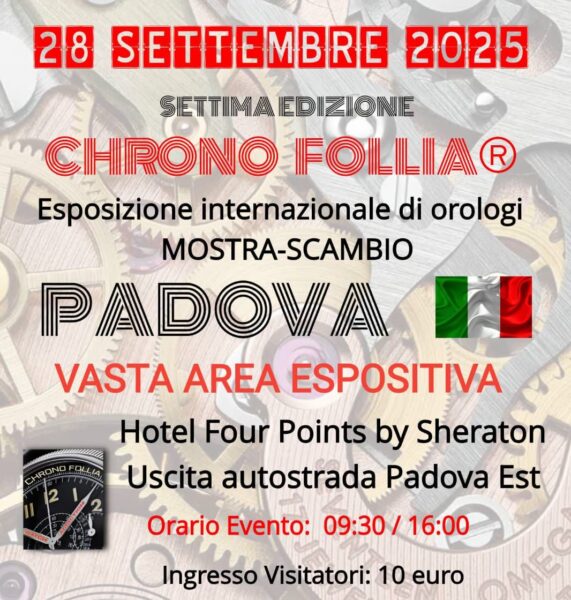 Padova – Domenica 28 settembre torna CHRONO FOLLIA, l’appuntamento internazionale dedicato al mondo dell’orologeria che giunge alla sua settima edizione. L’evento si svolgerà presso l’Hotel Four Points by Sheraton (uscita autostradale Padova Est) e offrirà una vasta area espositiva aperta al pubblico dalle 09:30 alle 16:00.