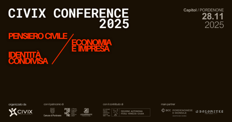 Civix Conference 2025 è un evento realizzato con il patrocinio di: Comune di Pordenone, Pordenone Verso Capitale italiana della Cultura 2027 e Legambiente Pordenone.