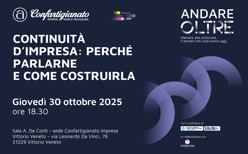 «Le PMI sono sfidate da tre faglie di cambiamento: le trasformazioni delle catene del valore, la carenza di manodopera specializzata, la continuità aziendale. Proprio su quest’ultimo punto si gioca un patrimonio di conoscenze che rende competitivo il Made in Treviso. Ecco perché oggi è essenziale parlare di continuità d’impresa e di come costruirla». Con queste parole Armando Sartori, presidente diConfartigianatoImprese Marca Trevigiana, lancia la terza tappa del progetto “Andare oltre – Allenarsi alla continuità” di Confartigianato Imprese Marca Trevigiana.
