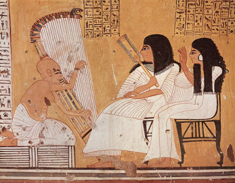 Il defunto e sua moglie ascoltano il canto di un arpista, dalla tomba di Inerkhau (TT359) a Deir el-Medina (XX dinastia, 1189-1077 a.C.)