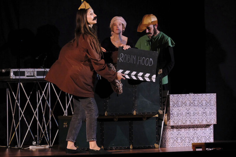 Lo spettacolo “Robin Hood” è cominciato in sordina, con gli attori entrati dal fondo, fingendosi viaggiatori in cerca della stazione, coi bambini presi in contropiede che non si sono accorti quasi di nulla. Poi son saliti sul palco e sono stati “bloccati” da un tronfio regista-attore che, con la promessa di pagarli, li ha scritturati per rappresentare la leggenda di Robin Hood. Da qui i bambini, dapprima non ancora sicuri di stare assistendo allo spettacolo, hanno cominciato a partecipare, dare battute, fare commenti a voce alta, applaudire in una vera esaltazione. Assolutamente fantastici gli attori nell’inscenare la sgangheratezza più totale. Con costumi raffazzonati, palloncini come sfere di cristallo, griglie di cartone per sbarre di prigione, un serpente-pupazzo assolutamente esilarante, la recita di scene in inglese. Un tripudio di fantasia allo stato puro, accompagnata dalla musica dal vivo. Testo e regia di Angelo Lelio, anche nel ruolo del regista e di Riccardo Cuor di leone. In scena, Fabia Ceccon (la cantastorie, Chimera e tutto il resto), Dario Zisa (uno spassoso Robin Hood e il serpente) e Barbara Scalco (Lady Marian, Little John).