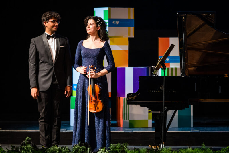 Sofia De Martis, si è avvicinata allo studio del violino a sette anni, si è diplomata al Conservatorio di Musica Giuseppe Tartini di Trieste nel 2025. Ha ottenuto numerosi Primi Premi Assoluti in Concorsi Internazionali ed è stata semifinalista nell’edizione 2023 del “Concorso di Violino Città di Vittorio Veneto”. Nel 2025 si è aggiudicata il Primo Premio al Concorso “Todi Città del Violino” organizzato dalla Consolazione ETAB, ottenendo in prestito biennale un prezioso violino Giuseppe Odoardi del 1780. Ha intrapreso la carriera da solista con l’Orchestra del Teatro Lirico Verdi di Trieste diretta da F. M. Sardelli e si è esibita con l’Orchestra Filarmonica Città di Monfalcone, l’Orchestra da Camera FVG, l’Orchestra da Camera Ferruccio Busoni e I Musici di Parma. Nell’estate 2023 è stata invitata tra i Nuovi Concertisti in occasione del Festival Internazionale di Musica di Portogruaro. Matteo Di Bella ha iniziato lo studio del pianoforte a quattro anni e a nove anni ha intrapreso la sua formazione al Conservatorio Jacopo Tomadini di Udine. Nel corso degli anni ha partecipato a numerosi concorsi, aggiudicandosi diversi Primi Premi, ed è stato recentemente finalista al Premio “Brunelli” di Vicenza. Nel 2017 ha fondato insieme a L. Ritacco il Duo pianistico En Blanc Et Noir, dedicandosi a un repertorio ricercato e talvolta inedito di vari compositori contemporanei e combinando la musica con il live electronics, come nel progetto “The Planets” ispirato alle musiche di G. Holst. Nel gennaio 2024 in Duo ha vinto il Primo Premio al Concorso “L. Caraian” di Trieste e il Primo Premio al Concorso “Pietro Argento” di Bari. Ha inciso la Sesta Sinfonia di Beethoven a otto mani per Kawai Milano ed è membro ufficiale di Dolce Époque, spettacolo crossover scenico-musicale che si esibisce in tutta Europa. Si è esibito in vari teatri tra cui il Teatro Verdi di Trieste, il Politeama Rossetti di Trieste, il Teatro Comunale Pavarotti di Modena e il Teatro Olimpico di Vicenza. Da solista, ha suonato con l’Orchestra Sinfonica del Conservatorio di Trieste e con l’Orchestra Regionale Filarmonia Veneta. Ha concluso il Biennio di Pianoforte e di Musica da Camera al Conservatorio G. Tartini di Trieste.