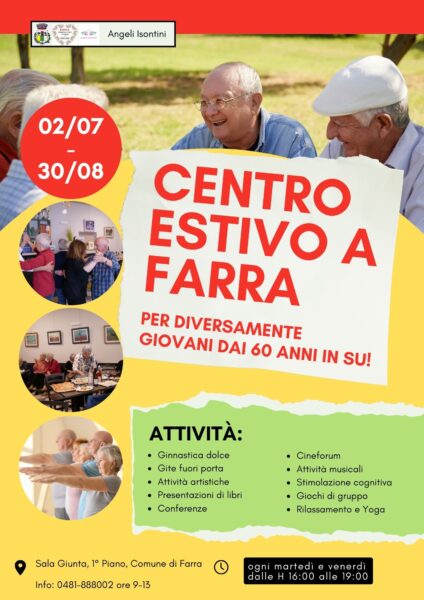 Il Comune di Farra d’Isonzo è lieto di annunciare l’avvio della seconda edizione del Centro Estivo per Diversamente Giovani, rivolto a tutte le persone dai 65 anni in su, in programma dal 16 giugno al 22 agosto 2025, ogni lunedì, mercoledì e venerdì dalle ore 16.00 alle 19.00.