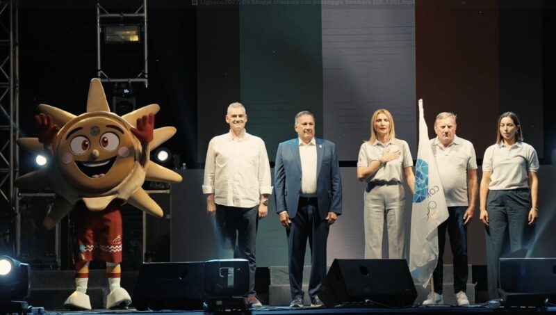 Trieste, 27 luglio 2025 – Sabato 26 luglio, in Macedonia del Nord, in occasione della cerimonia di chiusura dei giochi Eyof Skopje 2025, che si sono svolti dal 20 al 26 luglio, è arrivato il momento più atteso, il passaggio della bandiera olimpica a Lignano 2027. Il presidente dei Comitato Olimpico Europeo, Spyros Capralos ha consegnato l’insegna al presidente esecutivo di Lignano 2027, Giorgio Brandolin (nominato anche presidente onorario del CONI Friuli Venezia Giulia pochi giorni fa), accompagnato sul palco dalla campionessa olimpica di scherma (vice presidente) Mara Navarria e dalla sindaca di Lignano, Laura Giorgi.