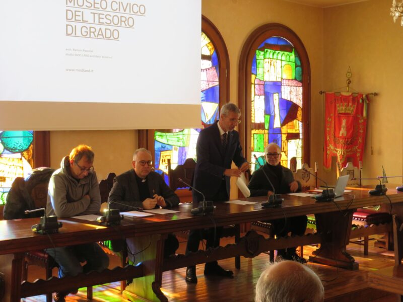 GRADO – È un appuntamento con la storia quello fissato per il prossimo 6 dicembre, data in cui Grado riabbraccerà ufficialmente la sua memoria più preziosa. Negli spazi restaurati dell’ex canonica di piazza Biagio Marin verrà inaugurato il Museo civico del Tesoro, un’istituzione nata per custodire e valorizzare il patrimonio sacro della basilica di Santa Eufemia. L’intitolazione non è casuale: il museo porterà il nome di monsignor Sebastiano Tognon, l’amato “don Bastiàn”, arciprete dal 1913 al 1956. Fu proprio la sua lungimiranza a mettere in salvo il tesoro liturgico durante i bombardamenti della Prima guerra mondiale, permettendo che giungesse intatto fino a noi. L’operazione, resa possibile da un accordo tra il Comune e la Parrocchia con l’approvazione dell’arcivescovo di Gorizia Carlo Roberto Maria Redaelli, è stata presentata alla presenza del sindaco Giuseppe Corbatto, del parroco monsignor Paolo Nutarelli, del curatore scientifico Dario Gaddi e dell’architetto Ramon Pascolat.