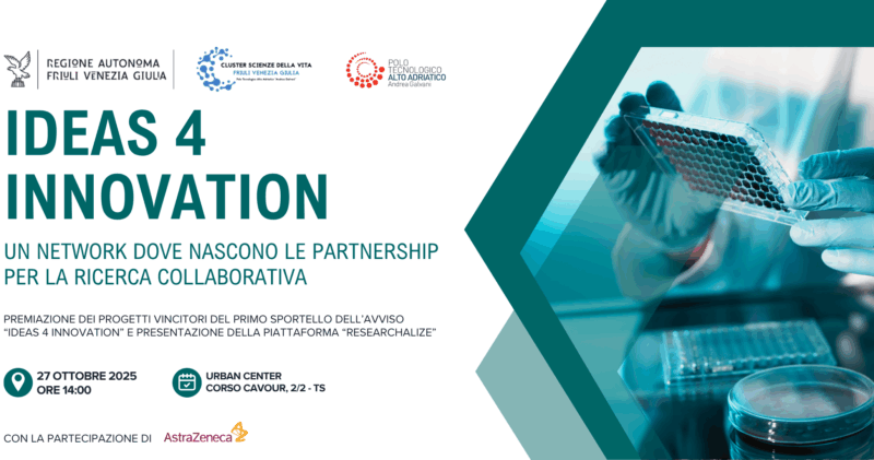 Lunedì 27 ottobre 2025, dalle ore 14.00, all’Urban Center di Trieste (Corso Cavour, 2/2) saranno premiati i vincitori della prima edizione di “Ideas 4 Innovation”, iniziativa che promuove la collaborazione tra soggetti pubblici e privati dell’ecosistema Scienze della Vita in Friuli Venezia Giulia perchè va a sostenere progetti nel settore Scienze della Vita promossi da PMI, start-up innovative e spin-off realizzati in sinergia con altre micro, piccole, medie e grandi imprese, start up innovative e spin off, università, centri di ricerca o strutture sanitarie con sede in Friuli Venezia Giulia.
