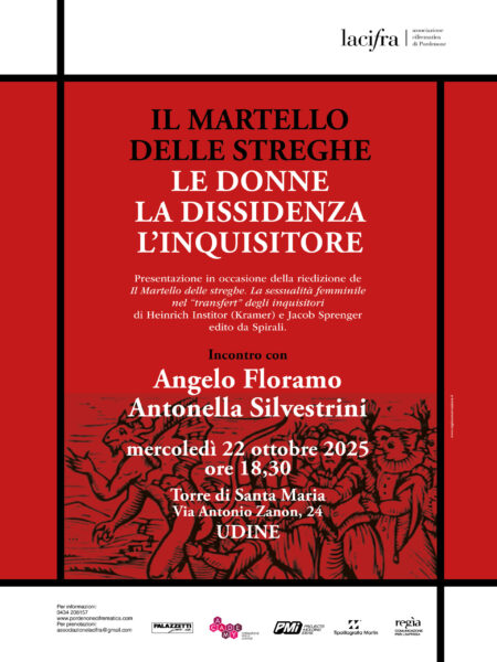 Mercoledì 22 ottobre alle ore 18,30 nella Sala S. Maria della Torre di Udine, Antonella Silvestrini, psicanalista e presidente dell’Associazione la cifra, e Angelo Floramo, scrittore e storico, interverranno in un incontro dal titolo Il martello delle streghe. Le donne, la dissidenza, l’inquisitore.