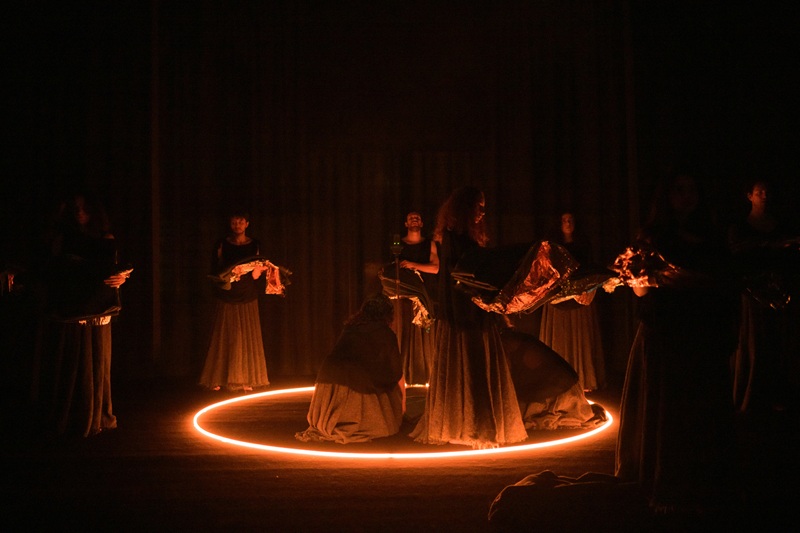 Baccanti è il punto di arrivo di un triennio dedicato allo studio delle seguaci del culto di Dioniso, dio dell’ebbrezza, della fecondità della Natura e della trasformazione, quindi del teatro. Partendo dalla ricerca sullo stato di trance come strumento poetico e scenico, mutando il bosco risvegliato dalla primavera dell’opera di Euripide in un oscuro sabba/rave notturno, lo spettacolo di Anagoor indaga il senso di identità e di appartenenza: “Le Baccanti, sospese tra estasi e sovversione, si fanno portatrici di un’esperienza collettiva in cui i confini tra umano e divino si dissolvono. La loro non è solo celebrazione dell’alterità, ma un atto di trasformazione capace di mettere in discussione convenzioni sociali e strutture di potere” si legge nelle note di regia.