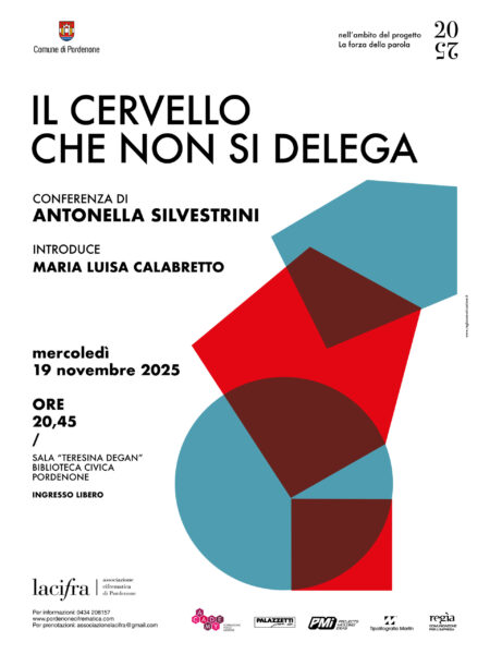 Mercoledì 19 novembre 2025 alle ore 20,45, nella Sala Teresina Degan della Biblioteca Civica di Pordenone, Antonella Silvestrini terrà una conferenza dal titolo “Il cervello che non si delega”, organizzata dall’Associazione “la cifra” nell’ambito del progetto “La forza della parola” e introdotta da Maria Luisa Calabretto.