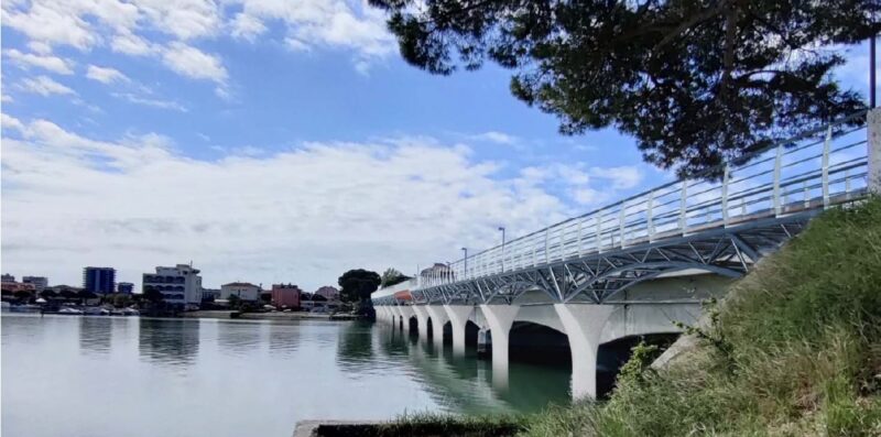 un segmento di circa 590 metri, particolarmente delicato perché coinvolge l’area del ponte girevole di accesso a Grado, dove finora i ciclisti erano costretti ad abbandonare il percorso protetto per attraversare un tratto ad alta intensità di traffico, soprattutto durante la stagione estiva. Con la nuova opera, questa criticità sarà superata grazie alla realizzazione di una pista ciclabile a doppio senso di marcia su sede propria, separata con un guard rail dalla carreggiata, con larghezza standard di 3,40 metri, ridotta a 3,10 metri in corrispondenza del ponte.