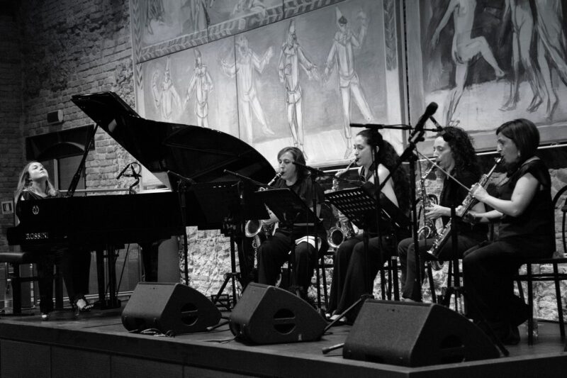 La collaborazione tra Sara Jane Ghiotti, eclettica interprete jazz, e il Gershwin Quintet formato da Letizia Ragazzini sax soprano, Mariella Donnaloia sax contralto, Caroline Halleck, sax tenore, Laura Rocchegiani sax baritono e Maria Giulia Cester pianoforte, nasce dall’amore comune per due giganti della musica del Novecento. La musica di Gershwin, vivace e sinuosa, apre le porte delle sale da concerto al jazz, raccogliendone i ritmi afroamericani e mescolandoli con il linguaggio classico. A questa energia si contrappone l’eleganza malinconica della musica francese degli anni Quaranta, caratterizzata da quella leggera malinconia dei tempi ternari e melodie coinvolgenti, che hanno reso immortale la voce di Édith Piaf.