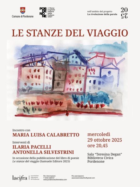 L’Associazione “la cifra” organizza un incontro con Maria Luisa Calabretto per la presentazione del suo libro di poesia “Le stanze del viaggio” (Samuele Editore 2025) nella sala Degan della Biblioteca Civica di Pordenone il 29 ottobre 2025 alle ore 20,45.