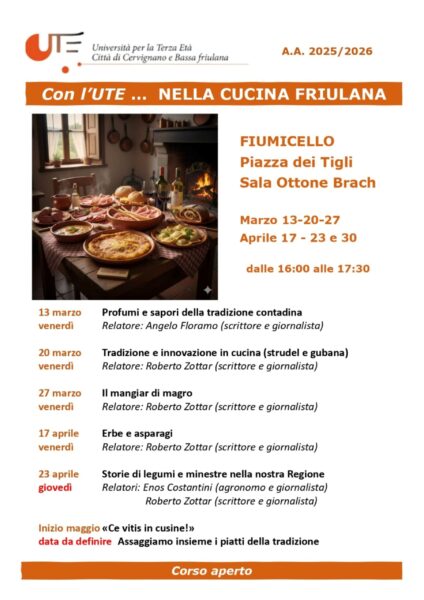 FIUMICELLO – Un viaggio che non è solo gastronomico, ma profondamente culturale: l’Università per la Terza Età della Città di Cervignano e della Bassa Friulana inaugura, per l’anno accademico 2025/2026, l’atteso ciclo di incontri dal titolo “Con l’UTE… nella cucina friulana”. Le lezioni si terranno presso la Sala Ottone Brach in Piazza dei Tigli a Fiumicello, trasformando il cuore del paese in un laboratorio di memoria e gusto. Gli appuntamenti si svolgeranno prevalentemente di venerdì, dalle 16:00 alle 17:30, offrendo un’occasione di approfondimento guidata da relatori di eccezione. Il percorso prenderà il via il 13 marzo con lo scrittore e giornalista Angelo Floramo, che accompagnerà il pubblico tra i “Profumi e sapori della tradizione contadina”, un’esplorazione dell’identità rurale della nostra terra attraverso il cibo. Il testimone passerà poi a Roberto Zottar, figura di riferimento del giornalismo enogastronomico regionale, che curerà una serie di focus tematici: 20 marzo: Il confronto tra “Tradizione e innovazione”, con protagonisti dolci iconici come lo strudel e la gubana. 27 marzo: Un approfondimento dedicato al “Mangiar di magro”. 17 aprile: La stagionalità in tavola con un incontro su “Erbe e asparagi”.