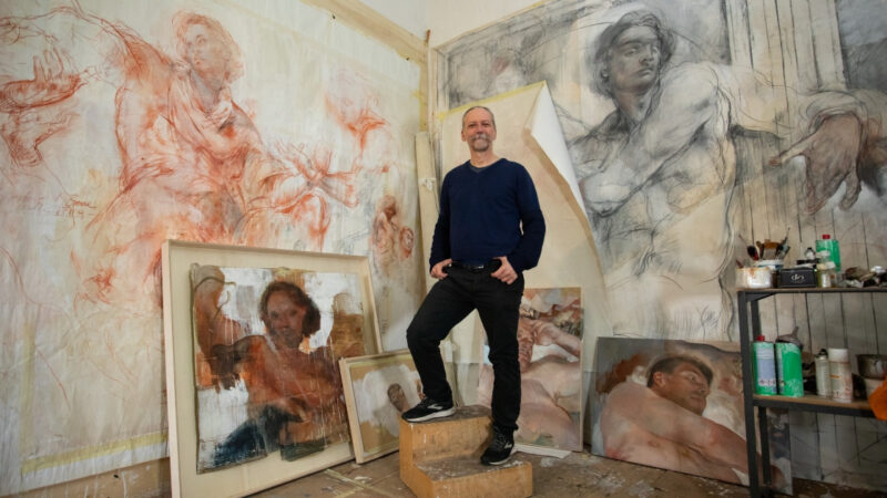 Stefano Reolon cavalca il corpo tra Rembrandt e Michelangelo con perfetta padronanza dell’anatomia e utilizzo di materia pittorica che realizza secondo precetti e ricettari antichi. Alla classicità dell’impianto contrappone una forte spinta contemporanea che vede i suoi corpi nudi in continua torsione avvilupparsi tra loro, dando vita a una poetica che celebra la bellezza e il trionfo della carnalità.