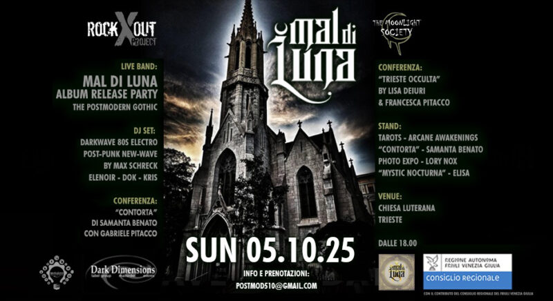 Rock Out X Project, The Moonlight Society e S@NGIORGIO 2020 sono orgogliosi di presentare un appuntamento imperdibile per gli amanti della musica e delle atmosfere gotiche: il release party dell’attesissimo album di debutto “The Postmodern Gothic” dei Mal di Luna, pubblicato per la storica etichetta tedesca “Alice In…”(Dark Dimensions Label Group).