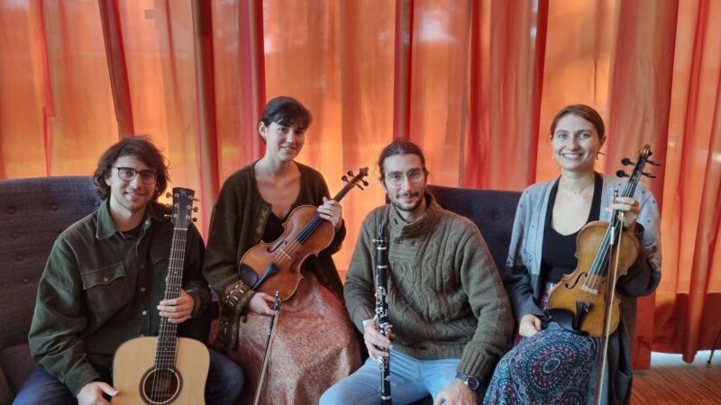 Dinamico e musicalmente curioso il quartetto che sarà protagonista dell’evento, formato da Anna Gioria, voce e violino, Gabriele Putzulu, chitarra acustica e stompbox, Viola Innocenti, voce e viola, Yarince Vicenzo, clarinetto e bodhran. Il progetto Boccadoro nasce infatti dal desiderio di quattro giovani musicisti italiani di unire la formazione classica all’energia vitale della musica popolare e del Balfolk, senza separare i vari stili musicali, ma al contrario unendo il loro background – ovvero precisione di esecuzione, attitudine alla polifonia e a costruzioni armoniche complesse – con la propensione al ritmo, alla danza e all’espressività. Boccadoro accompagna dunque la platea alla scoperta delle danze d’Europa – dalla Francia alla Svezia, dall’Irlanda alla Sicilia – e delle proprie composizioni originali, pagine dove la tradizione incontra la libertà del gioco e dell’ispirazione. Dal ritmo incalzante del “Reel” irlandese alle atmosfere sognanti di “Drops of Waltz”, il concerto è un percorso tra sonorità che parlano di memoria, incontro, leggerezza e profondità. Ogni brano è un invito al movimento, una soglia che apre alla possibilità di danzare insieme, o semplicemente ascoltare. La danza non è qui solo un passo: è una forma d’arte che unisce. E i musicisti dell’ensemble Boccadoro, con radici classiche e sguardo rivolto al mondo, la rendono esperienza viva.