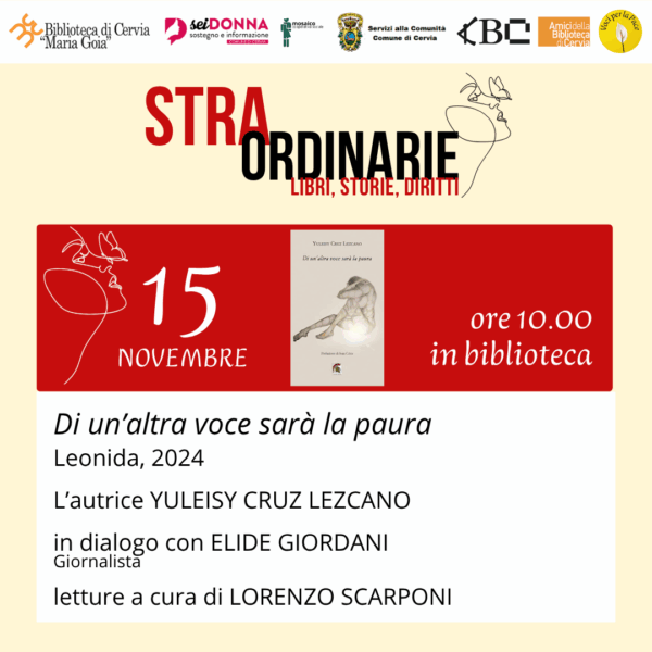 CERVIA – sabato 15 novembre 2025, alle ore 10:00, presso la Biblioteca Comunale “Maria Goia” (Via Circonvallazione Edoardo Sacchetti, 111 – 48015 Cervia, RA), si terrà la presentazione del libro Di un’altra voce sarà la paura, edito da Leonida Edizioni, della dottoressa Yuleisy Cruz Lezcano.