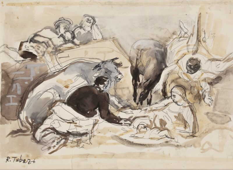 Attento anche agli sviluppi dell’arte italiana dell’immediato dopoguerra, come si evince dalla serie di bellissime nature morte degli anni attorno al ’50, Renzo Tubaro ha ricevuto vasto apprezzamento da critici – e intellettuali – quali Pier Paolo Pasolini e Carlo Sgorlon. Nel 1997 il suo lavoro di affrescatore è stato attentamente esaminato in una mostra presso Villa Manin e in un volume a cura di Fulvio Dell’Agnese. Proprio da quest’ambito vengono i trenta disegni, assolutamente inediti, che costituiscono la rassegna presso il Centro Aldo Moro di Cordenons: «lavori in varie tecniche che – spiega il curatore della mostra Giancarlo Pauletto – rappresentano appunto le prime idee di quegli affreschi, o magari di altre opere di arte sacra che potevano occupare la mente dell’artista, e che oggi possono essere tranquillamente considerati come storiche testimonianze di un’arte certo classicamente atteggiata, ma non per questo meno ricca di vivacità, di immediatezza visiva, di sciolta, concreta capacità di intuire uno spazio, di rappresentare un’emozione, un affetto, un movimento. Parecchi di questi disegni sono stazioni di Via Crucis, la caduta sotto la croce, l’incontro con le pie donne, la Veronica, le deposizioni, le crocifissioni. Particolarmente belle sono proprio le deposizioni: Tubaro sembra avere una sorta di predilezione per questo tema, trattato molte volte e in molti modi, forse perché si tratta di un tema in qualche modo affine alle “maternità”, così frequente nella sua pittura e nel suo disegno. E uscendo dal tema “Via Crucis”, vi sono molti altri disegni da osservare, sempre legati a momenti della vita di Cristo. Come la bellissima Natività, dove la Madonna appare come appagata dopo il parto, e San Giuseppe si protende con fare affettuoso verso il Bambino, mentre altrettanto partecipi appaiono l’asino, il bue e l’angelo sospeso sulla destra. O i tre “Battesimi di Cristo”, segni tutti e tre di una vitalità culturale fondata sulla conoscenza della grande tradizione veneziana».