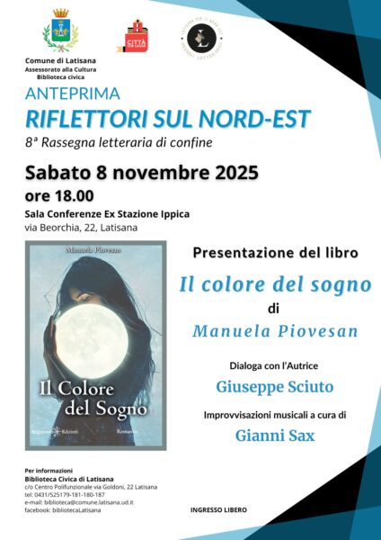 Latisana, 7 novembre 2025 – Torna Riflettori sul Nord-Est, la rassegna letteraria di confine, giunta alla sua 8^ edizione, organizzata dall’Assessorato alla Cultura del Comune di Latisana insieme alla Biblioteca Civica di Latisana e nata nell’ambito del Premio Letterario Internazionale “Latisana per il Nord-Est”, in cui autori e autrici incontrano il pubblico, sia in appuntamenti dedicati alla collettività sia in incontri appositamente pensati per le scuole. L’anteprima della rassegna è in programma domani, sabato 8 novembre alle 18.00, presso la Sala Conferenze ex Stazione Ippica, in via Beorchia 22 a Latisana (UD); protagonista, il romanzo di Manuela Piovesan Il colore del sogno.