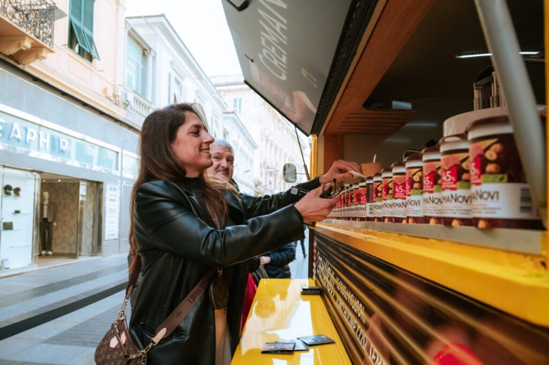 L’operazione si estende fino al cuore simbolico del Festival, con la personalizzazione del bar di fronte al Teatro Ariston: la trasformazione del Gelatè di Sanremo in una vera e propria cioccolateria brandizzata Novi, che per tutta la durata del Festival diventa punto di incontro, degustazione e racconto del marchio.