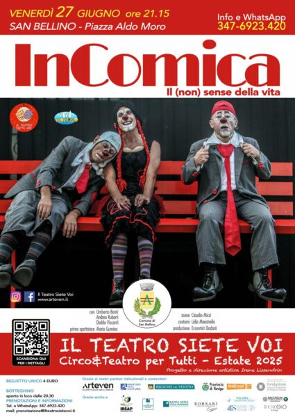 SAN BELLINO (RO), 26 giugno 2025 – Imprevisto cambio di programma nel cartellone de “Il teatro siete voi – estate” che domani 27 giugno, alle 21.15, porterà in piazza Aldo Moro a San Bellino, uno spettacolo degli “Eccentrici Dadarò” in luogo dei previsti Pantakin. “Incomica” è il titolo: un vortice di clownerie, magia e trasformismo.