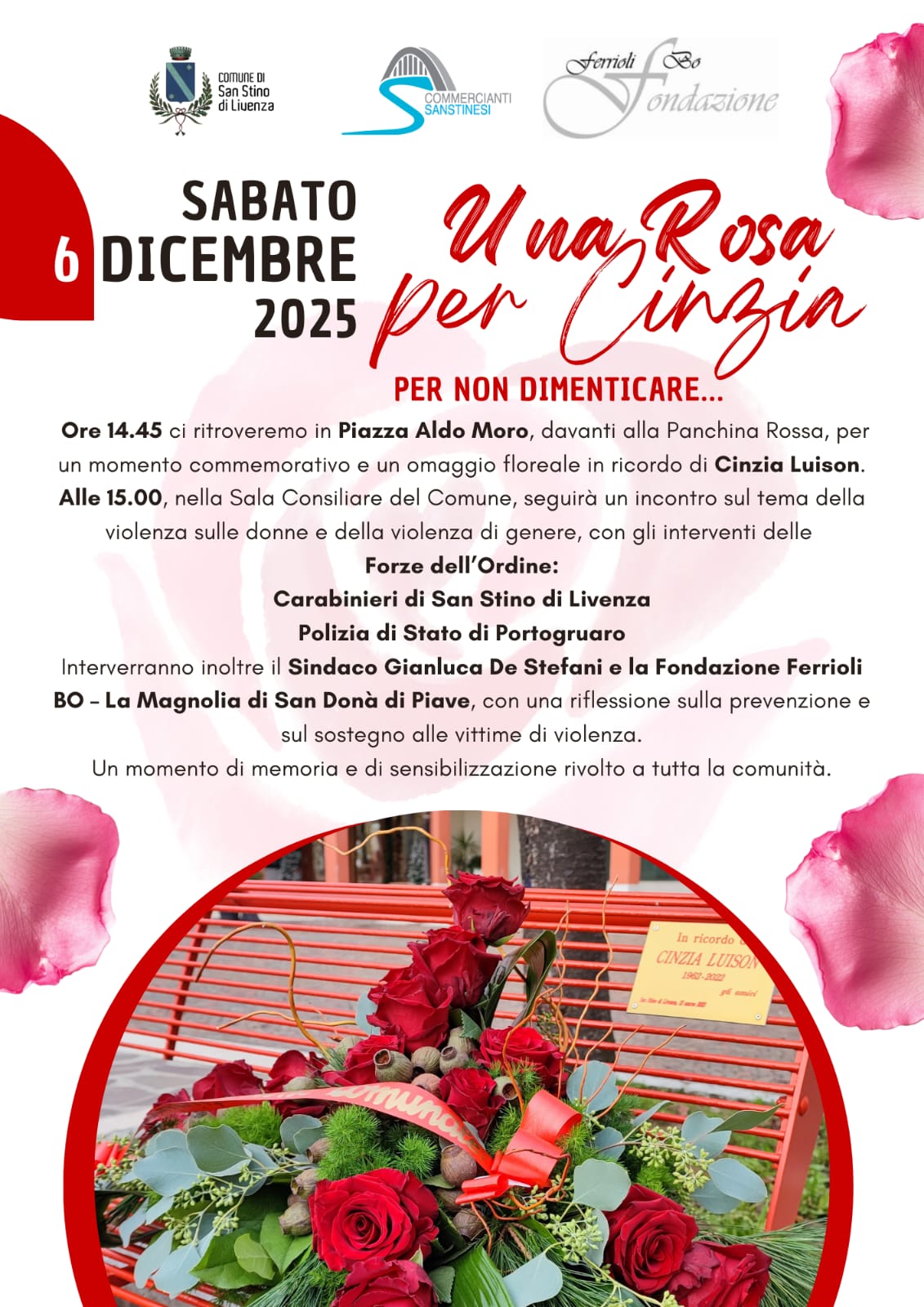 Una giornata per non dimenticare, ma anche per riflettere e rilanciare l’impegno di tutta la comunità per evitare che drammi del genere si ripetano. Sabato 6 dicembre, il Comune di San Stino di Livenza, in collaborazione con i Commercianti Sanstinesi e la Fondazione Ferrioli Bo, organizza “Una rosa per Cinzia”. Alle 14.45 tutta la comunità è invitata a ritrovarsi davanti alla Panchina Rossa, in Piazza Aldo Moro, per un momento commemorativo e un omaggio floreale in ricordo di Cinzia Luison, la parrucchiera di San Stino di Livenza uccisa a 60 anni dal marito. Era il 6 dicembre 2022.