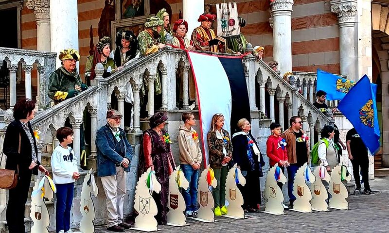 Prima di adire nuove vie di sviluppo per la rivisitazione a pedine, alea e quiz dell’antico Palio aprilano della Capitale del Friuli Storico, iniziativa avviata due anni or sono ed approdata lo scorso anno sulla pista storica di Mercatovecchio per iniziativa del Fogolâr Civic di Udin e su sollecito dell’Arengo cittadino, ora il locale presidente fogolarista prof. Alberto Travain, anche alla guida dell’Assemblea arengaria, si è rivolto alle autorità pubbliche referenti dei Consigli Comunali dei Ragazzi di Udine e Codroipo, la seconda città della provincia udinese, proponendo, per sabato 18 aprile 2026, quasi a ridosso della data canonica del 23, giorno di S. Giorgio, tradizionale scadenza civica e culturale per entrambe le località friulane, un derby paliesco con pedine equestri commemorative dei Comuni rustici aggregati ai nuclei dei due centri storici, esperienze incarnate di democrazia di base da integrarsi nella memoria e nella coscienza civiche delle nuove generazioni di cittadinanza. Pronti a correre per Udine i cavalli delle quattro Decanie storiche dei Borghi udinesi; per Codroipo, quattro tra le più rinomate delle numerose Vicinie del circondario. A spingere verso questa ipotesi, il fatto che lo scorso anno l’udinese “Pali di Avrîl” o “di S. Zorç” è stato vinto proprio dal Sindaco dei Ragazzi di Codroipo, il popolarissimo Pietro Mangiacapra, da Glaunicco (Camino al Tagliamento), il cui cavallo recava i colori dei Savorgnan, un tempo criptosignori di Udine e di mezzo Friuli. Con Mangiacapra corsero il Palio anche altri due membri del CCR codroipese, gli alunni Enea Sattolo ed Elia Zoratto, rispettivamente sotto le insegne dei casati udinesi Belloni e Arcoloniani, variamente legati anche alle vicende del Codroipese. I tre intervennero nella “Capitâl dal Friûl” innanzitutto in rappresentanza del “1n Cors di Oratorie publiche par furlan”, novità assoluta, avviato a Codroipo presso la locale scuola secondaria inferiore dallo stesso prof. Travain. Simpatica e qualificata la partecipazione di questi giovanissimi Demostene “furlans”. Da qui la sfida ai “sitadins” bianconeri. Il Sindaco di Udine, prof. De Toni, e la Dirigente scolastica codroipese, dott.ssa Salvador, avranno quindi tempo sino al 15 febbraio 2026 per accettare o cedere il campo a nome dei rispettivi CCR. Oltreché fortunate ai dadi – la gara è una sorta di gioco dell’oca – le due squadre dovranno dimostrare conoscenze storiche, culturali e linguistiche relative ad entrambe le realtà locali ed al Friuli tutto, acquisite da prontuari precedentemente loro distribuiti dal promotore Fogolâr Civic di Udin.