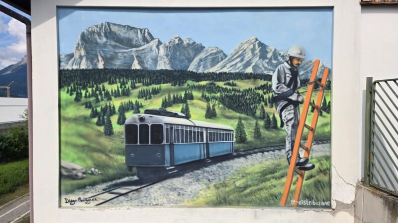A 62 anni di distanza il famoso trenino riprende vita, almeno virtualmente, grazie al tributo dedicato da E-Distribuzione attraverso il murales concluso in questi giorni su una delle pareti della sede dell’Azienda del Gruppo Enel che gestisce la rete elettrica a media e bassa tensione a Pieve di Cadore.