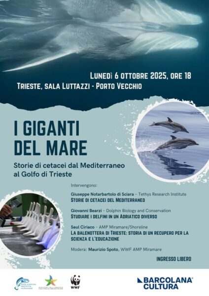 Al grande pubblico è invece dedicata la serata in programma lunedì 6 ottobre alle ore 18.00 presso la Sala Luttazzi del Magazzino 26, in Porto Vecchio, con ingresso libero e gratuito. L’appuntamento dal titolo “I giganti del mare: storie di cetacei dal Mediterraneo al Golfo di Trieste” offrirà l’occasione di scoprire il mondo delle balene e dei delfini grazie al racconto di due protagonisti della ricerca marina: Giuseppe Notarbartolo di Sciara e Giovanni Bearzi ci racconteranno chi sono i cetacei che navigano il Mediterraneo, le loro rotte, i comportamenti e le sfide che affrontano in un mare sotto pressione; come vengono studiati e monitorati grazie a tecniche moderne e collaborazioni internazionali; le minacce che li colpiscono e quali scenari possiamo immaginare per il loro futuro.