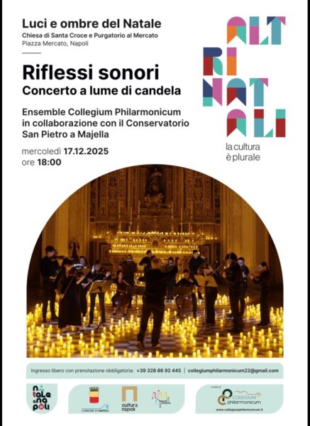 “Riflessi sonori” è un viaggio musicale che esplora il dialogo tra suono e silenzio, tra luce e ombra, restituendo al pubblico un Natale raccolto, emozionale, capace di parlare ai sensi e alla memoria.Protagonista della serata l’Ensemble Collegium Philarmonicum, in collaborazione con il Conservatorio San Pietro a Majella, per un concerto che unisce eccellenza musicale e suggestione visiva.