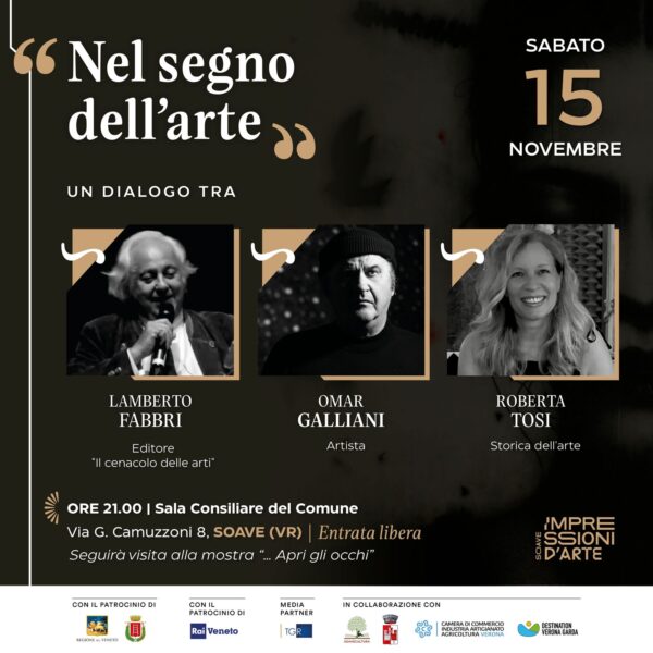 Un evento speciale firmato Soave Impressioni d’Arte, un’occasione unica per andare al cuore della creazione artistica. Omar Galliani, grande artista internazionale, in mostra nella Chiesa di Santa Maria dei Padri Domenicani con “… Apri gli occhi” fino al 30 novembre, insieme alla curatrice e storica dell’arte Roberta Tosi e all’editore di libri d’arte Lamberto Fabbri, presenta il prezioso volume “Nel segno dell’arte” (i quaderni del circolo degli artisti), una conversazione di parole e immagini fra Galliani e il poeta e scrittore Davide Rondoni. Appuntamento sabato 15 novembre ore 21 Sala Consiliare del Comune di Soave (ingresso libero). Il libro è un viaggio alla scoperta del vero significato dell’arte, dei suoi infiniti mondi, alla ricerca di quel segno che – nei versi di un poeta, in una fotografia, in una scultura, nel gesto di un danzatore, nella musica o in un film – indica quel mistero, quel “qualcosa che sta oltre” la realtà, al di là del visibile. Il dialogo intenso e profondo tra Galliani e Rondoni, fatto di testi, disegni, fotografie, poesie…suggerisce che la vita stessa è la più incredibile e meravigliosa opera d’arte, e solo l‘artista, con la sua sensibilità quasi mistica, riesce a suscitarne la “visione”, se non la piena comprensione. Un’esperienza che non è riservata solo all’artista: ciascuno, semplice “indagatore del mistero”, impara ad avere “occhi che sanno vedere”, e può cogliere questa essenza ovunque. Quando si contempla l’arte qualcosa di ineffabile ci raggiunge, ci fa crescere e ci avvicina alla comprensione di essere parte di una realtà più grande, quasi divina. Al termine dell’incontro, lo stesso Omar Galliani guiderà i presenti in una visita speciale alla sua mostra “…Apri gli occhi”, un privilegio raro per ascoltare la narrazione delle opere direttamente dalla sua voce. E ancora, sabato 22 novembre ore 18.30, visita guidata ad “…Apri gli occhi” con la curatrice Roberta Tosi. Per info e prenotazioni per la visita guidata del 22 novembre, chiamare + 39 333 463 8443.