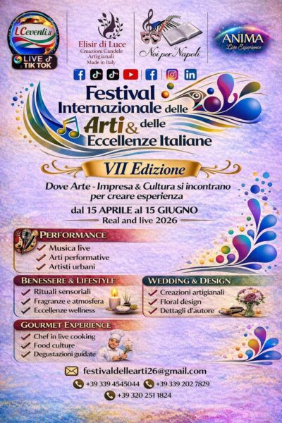 Sono ufficialmente aperte le iscrizioni alla VII Edizione del Festival Internazionale delle Arti & delle Eccellenze Italiane, in programma dal 15 aprile al 15 giugno 2026, un progetto culturale dedicato alla valorizzazione dei talenti, della creatività e delle eccellenze artistiche e produttive in una dimensione nazionale e internazionale.